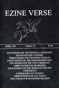 Ezine Verse is published whenever and wherever (except Chicago). Unsolicited manuscripts are discouraged. Claims for missing issues are hopeless. Any resemblance to anyone or anything living or dead in creative works contained herein is entirely a fabrication of the mind of the reader.